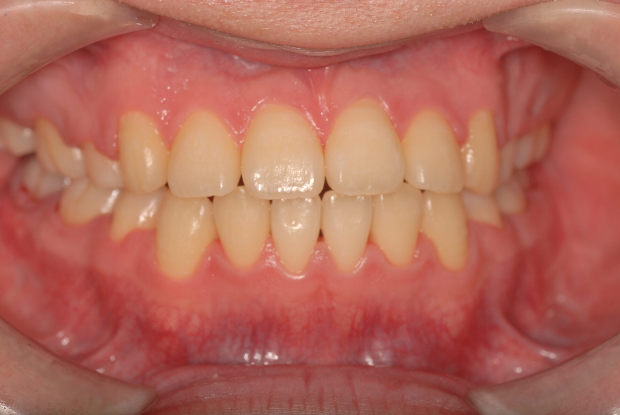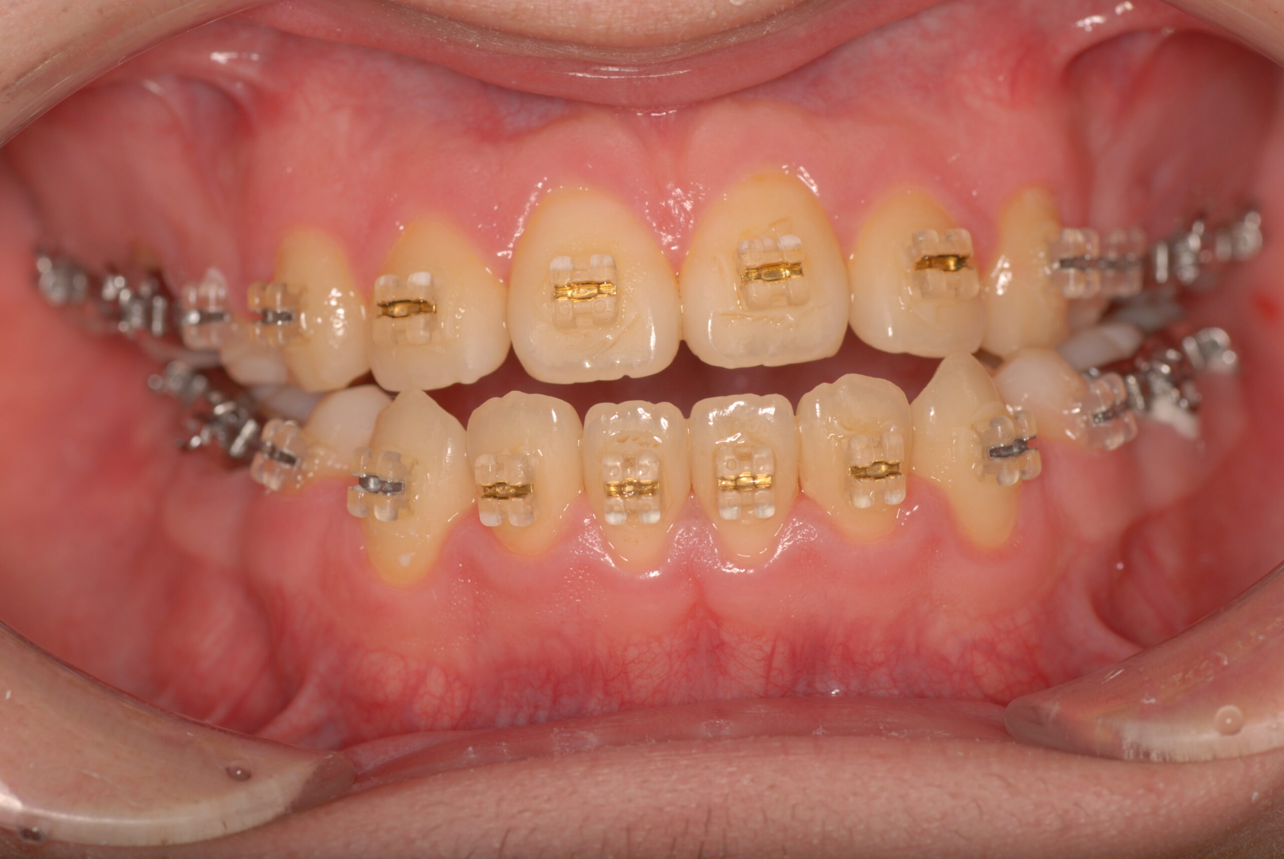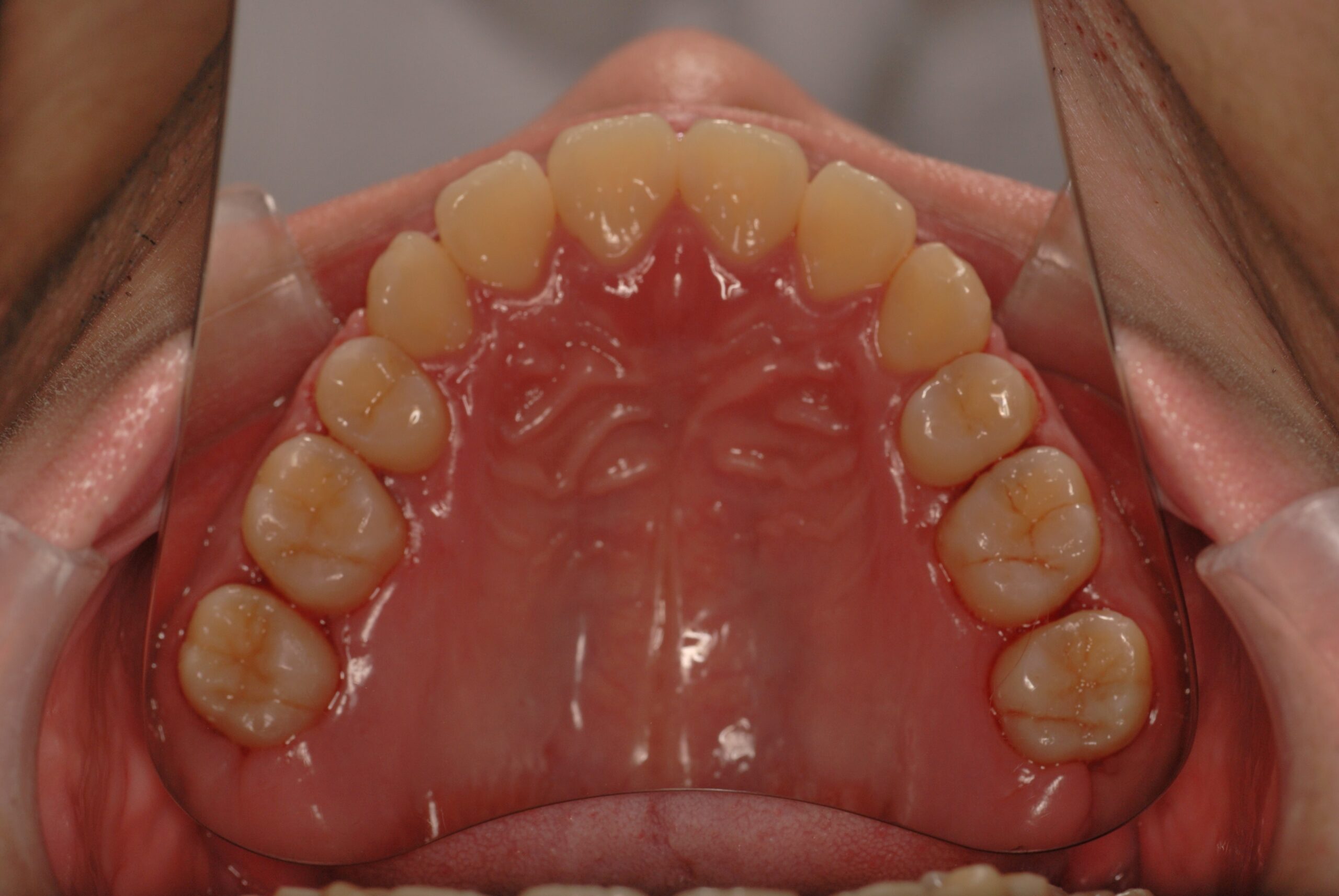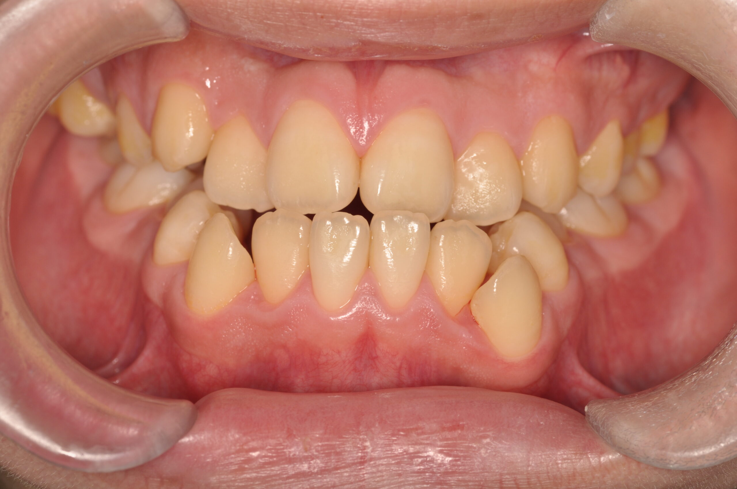 - 骨格性下顎前突症、下顎骨左偏位、叢生、 顎変形症として、外科的矯正術を計画。 叢生、右側第2大臼歯鋏状咬合。 上下顎第一小臼歯を抜歯し、抜歯空隙を利用し叢生を改善し、上下顎それぞれ歯列を整列し、矯正治療中に病院歯科口腔外科にて外科手術(近郊の病院歯科口腔外科にて、口の中から手術、2週間入院)により下顎骨の後退と左偏位の改善をし、適切なオーバージェット、オーバーバイトを付与する。