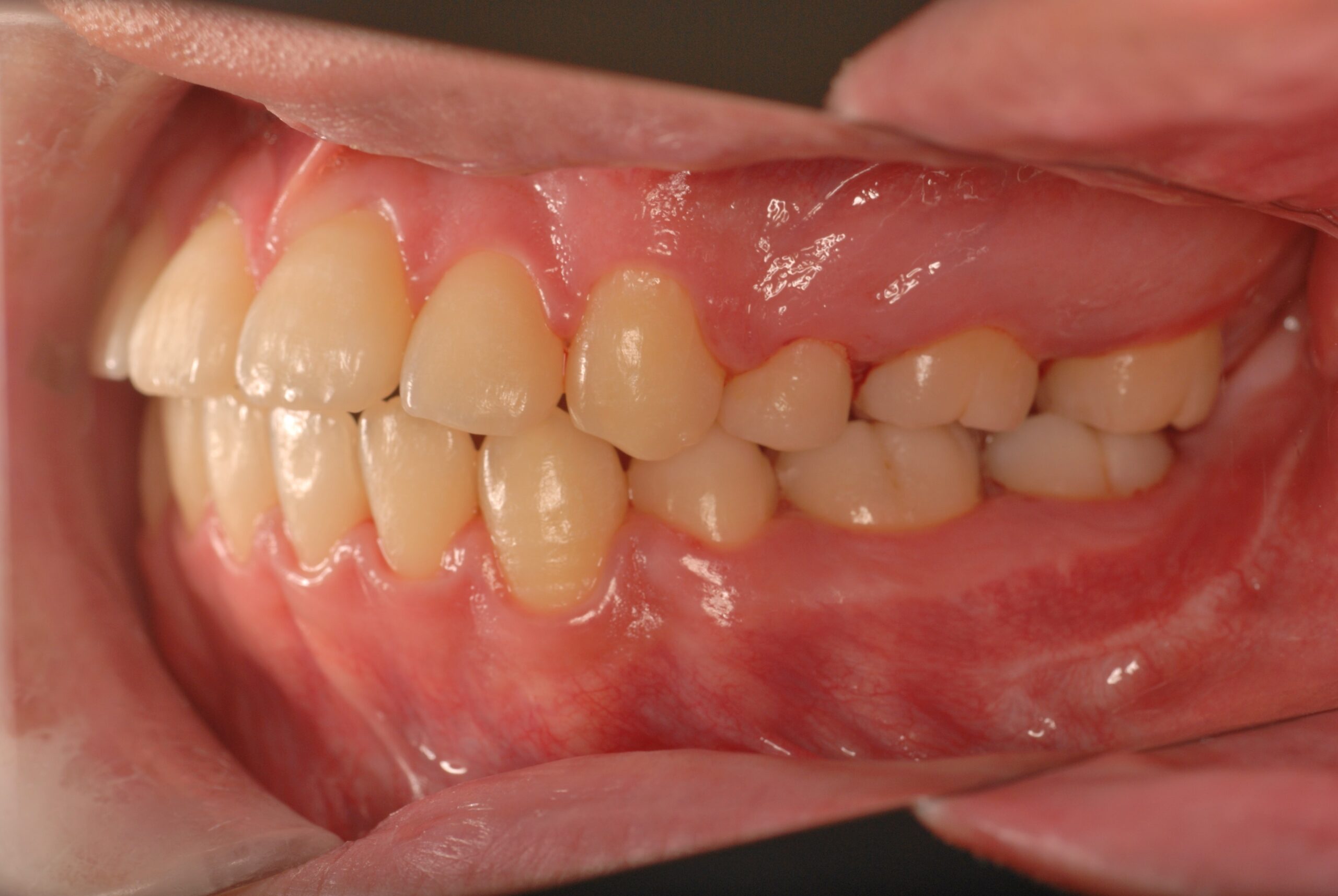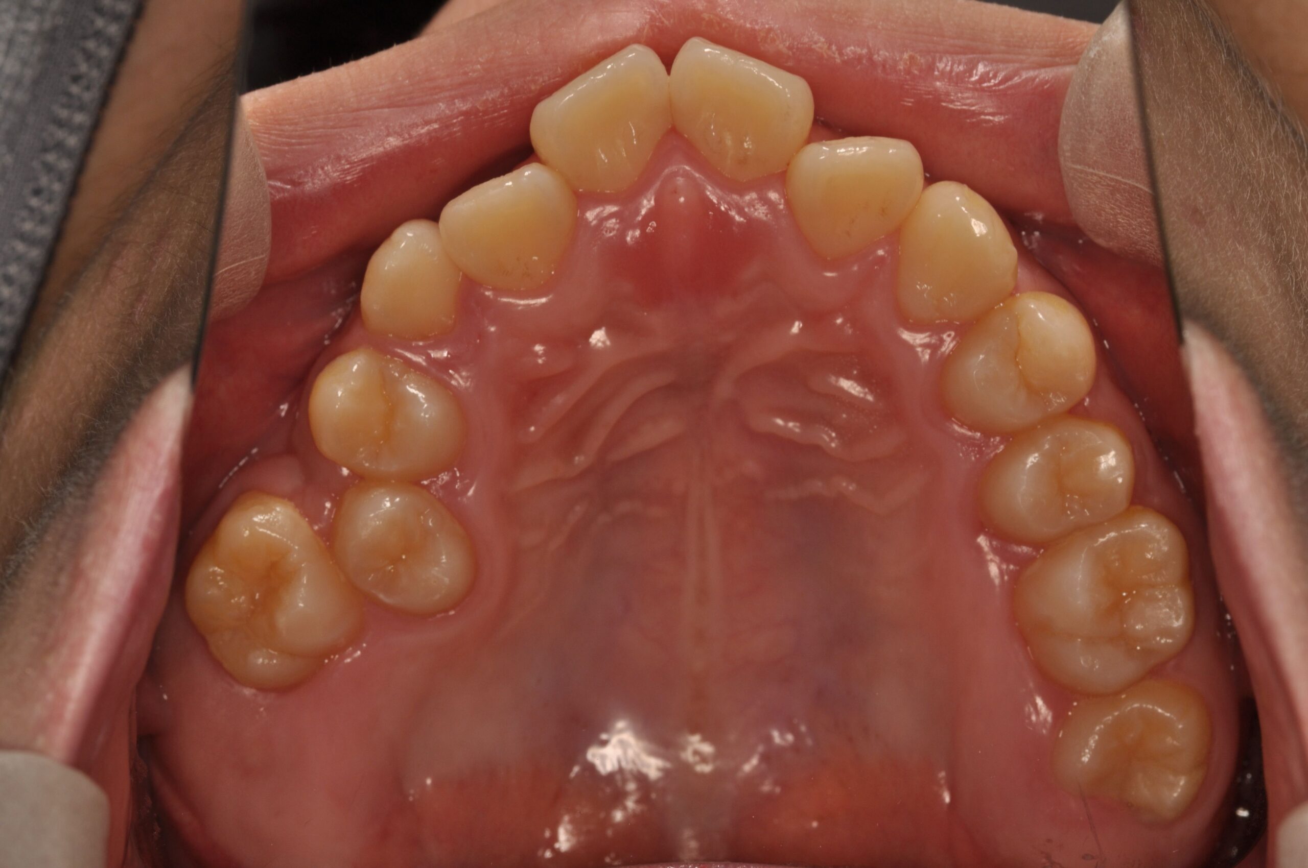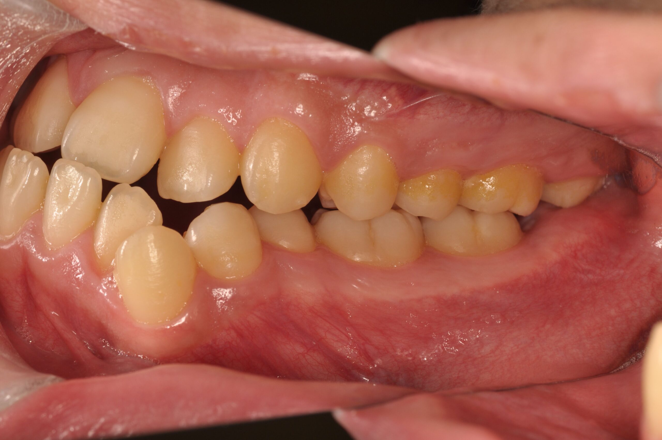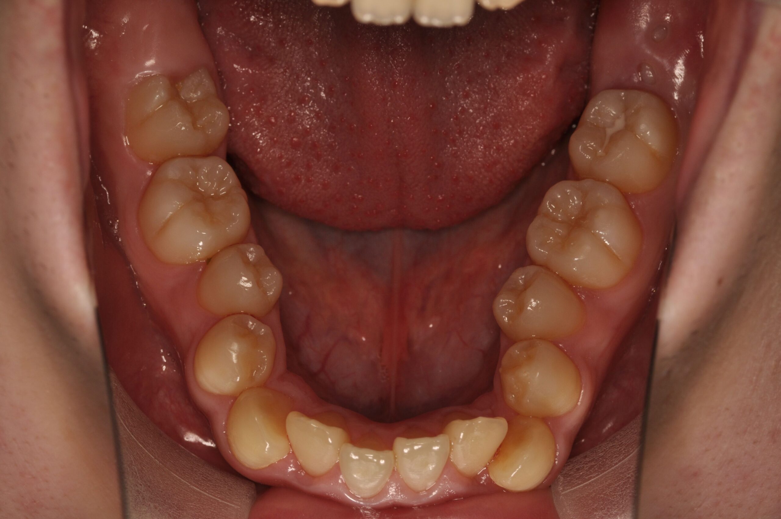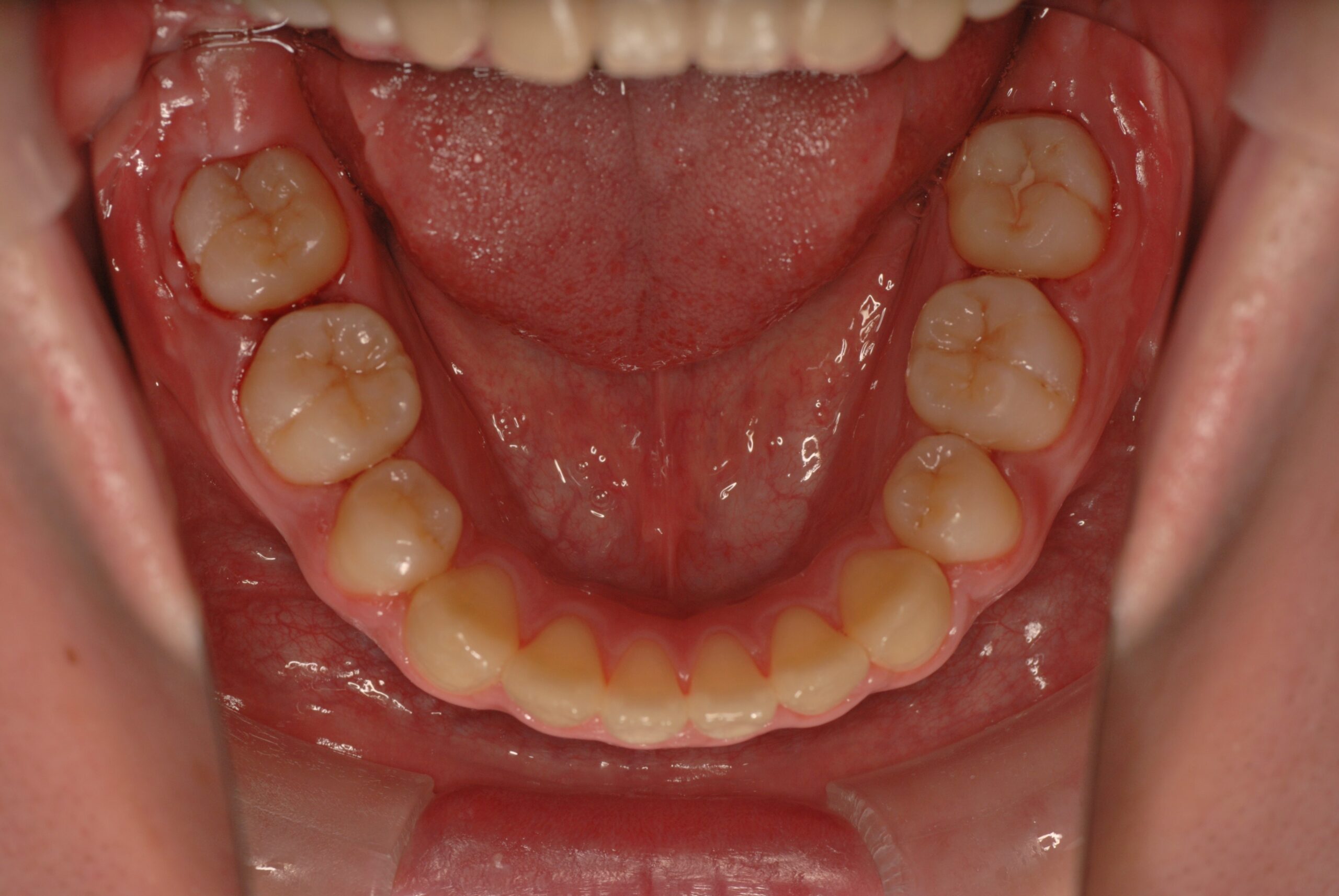 - 骨格性下顎前突症、下顎骨左偏位、叢生、 顎変形症として、外科的矯正術を計画。 叢生、右側第2大臼歯鋏状咬合。 上下顎第一小臼歯を抜歯し、抜歯空隙を利用し叢生を改善し、上下顎それぞれ歯列を整列し、矯正治療中に病院歯科口腔外科にて外科手術(近郊の病院歯科口腔外科にて、口の中から手術、2週間入院)により下顎骨の後退と左偏位の改善をし、適切なオーバージェット、オーバーバイトを付与する。